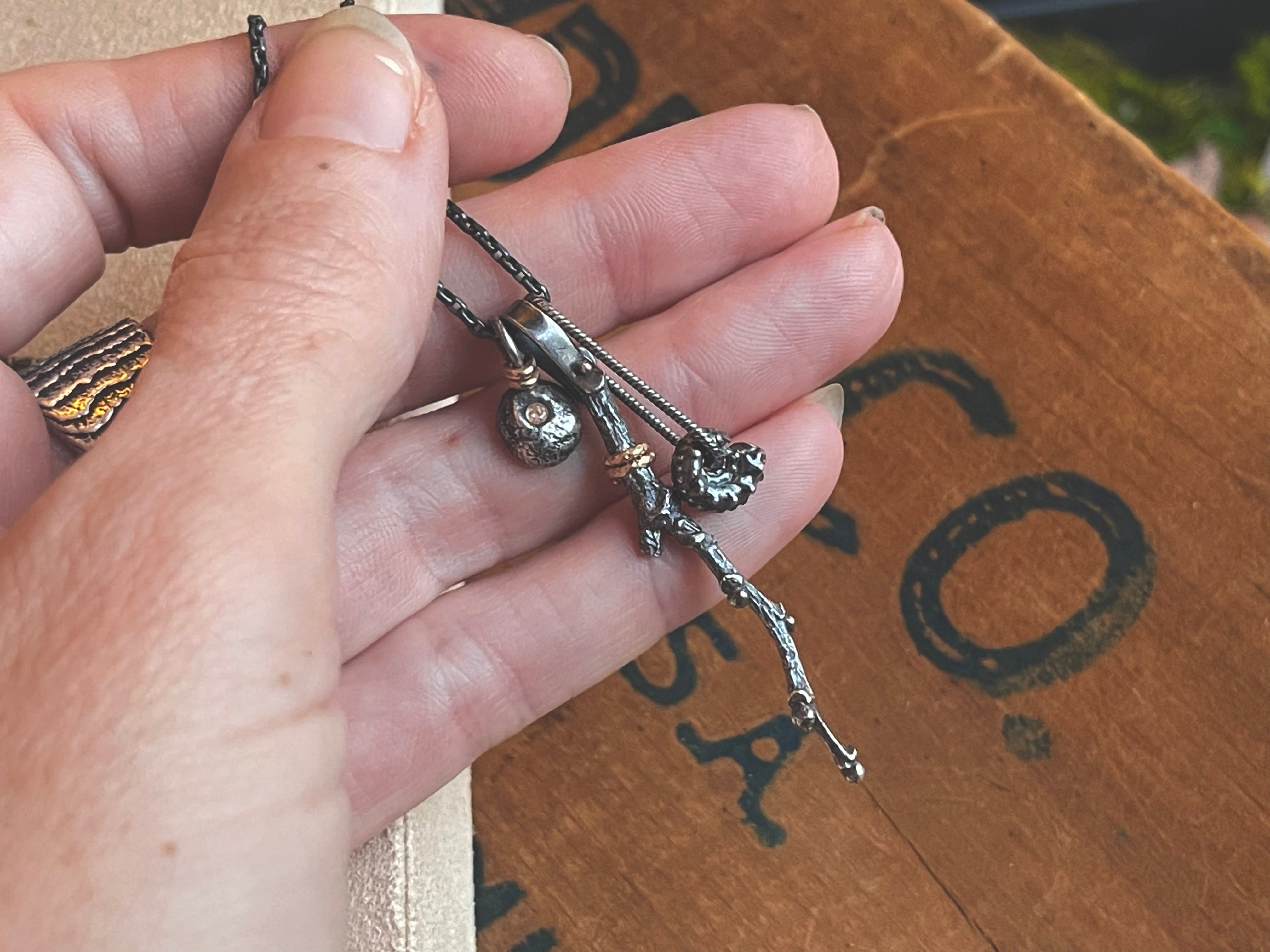 Naturalist meets mixed-metal lover. Another sweet little necklace from my "graves to gardens" series celebrating life out of death realities and metaphors. The fossil component represents the grave component of this storytelling piece, while the Dogwood twig represent the garden component